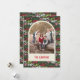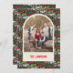 Fun modern photo holiday cards with a background pattern of colourful festive words "love, light, peace, joy, hope" in red, green pink and off white. Overlaid is your photo in an arch shape. Sign off in red font. The backer features the same fun lettered pattern as the front.