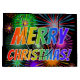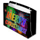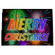 This fun, colourful, Christmas themed design features the message "MERRY CHRISTMAS!" having a rainbow inspired spectrum gradient pattern. It also features a vibrant and multicolored bursting fireworks inspired pattern. A giftbag like this might be a fun way to wrap a Christmas present being given to a friend or a relative.