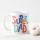 Fun t-coffee or tea mug with colourful cute simple SUPER DAD text written in a colourful stylish modern red, orange, blue, purple, and green coloured typography font.