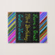 This fun, colourful and whimsical birthday themed puzzle design features a warm birthday wish like "Have a Great 73rd Birthday, Custom-Name!". The name can be personalized. There are also multicolored stripes at the top and bottom. A puzzle like this could be a fun way to deliver birthday wishes to somebody who is celebrating their seventy third birthday. [~Z0000268]