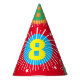 Fun custom kid's Birthday party paper cone hats. Cute design with personalized age number and fireworks and bright colours. Colours can be changed. Colourful design for children's celebration.