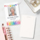 Vertical teacher ID badge personalized with photo, name, grade with coloured pencils in fun colours and a printed bunting flag banner in matching colours with patterned details, like stripes, dots, and stars. Colourful teacher ID badge with custom text and ID photo. Personalized kindergarten teacher ID with a fun design with coloured pencils in the colours of the rainbow.