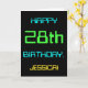 This simple and fun birthday greeting card design features a message like "HAPPY 28th BIRTHDAY, JESSICA!". Its appearance is inspired by the field of digital computing. The name on the front and the message on the inside can be personalized. It could be sent or given to somebody who is celebrating their twenty eighth birthday, and who perhaps works (or worked prior to retirement) as a computer programmer, a software developer, a database administrator, a network administrator, an electronics engineer, or who otherwise enjoys using computers. [~Z0000100]