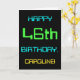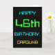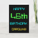 This simple and fun birthday greeting card design features a message like "HAPPY 46th BIRTHDAY, CAROLINE!". It also features a fun look inspired by digital computing. The name on the front and the message on the inside can be personalized. It could be sent or given to somebody who is celebrating their forty sixth birthday, and who perhaps works (or worked prior to retirement) as a computer programmer, a software developer, a database administrator, a network administrator, an electronics engineer, or who otherwise enjoys using computers. [~Z0000100]