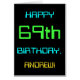 This simple and fun birthday greeting card design features a message like "HAPPY 69th BIRTHDAY, ANDREW!". It also features a fun appearance inspired by digital computing. The name on the front and the message on the inside can be customized. It could be sent or given to somebody who is celebrating their sixty ninth birthday, and who perhaps works (or worked prior to retirement) as a database administrator, a computer programmer, a network administrator, a software developer, an electrical engineer, or who otherwise enjoys using computers. [~Z0000100]