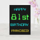 This simple and fun birthday greeting card design features a message like "HAPPY 81st BIRTHDAY, FRANCISCO!". It also features a fun look inspired by digital computing. The name on the front and the message on the inside can be personalized. It could be sent or given to somebody who is celebrating their eighty first birthday, and who perhaps works (or worked prior to retirement) as a computer programmer, a software developer, a database administrator, a network administrator, an electronics engineer, or who otherwise enjoys using computers. [~Z0000100]