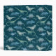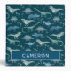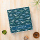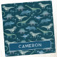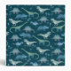 Lots of blue dinosaurs, Tyrannosaurus rex, Spinosaurus, Stegosaurus, Diplodocus and Triceratops on a dark teal green background. Original art by Nic Squirrell. Change the name to personalize.