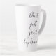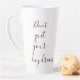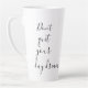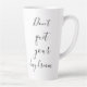 On this white classic latte mug is the text, "Don't quit your day dream" on either side in handwriting script creating an inspiring quote to start your day. Can be customized if you wish to use a different quote.