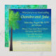 This is a fun festive beachy wedding invite with a dreamy aqua blue ocean backdrop complete with shimmery beach sands. A lone palm tree appears on sideof the card and the back of card has vibrant shades of tropical foliage. Casual fun in the sun vibes