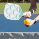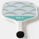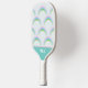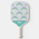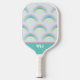 This design features dreamy pastel rainbows against a pale aqua background, with white initials in a fun text style against an aqua colour block. This fun pattern is great way to personalize your pickleball paddle and send your dinks over the rainbow. The paddle is shown with white trim, but other options are offered.