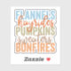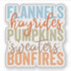 This vibrant and textured fall design highlights the quintessential elements of the autumn season with the words "Flannels," "Hayrides," "Pumpkins," "Sweaters," and "Bonfires." Each word is displayed in bold, uppercase letters, with a weathered texture that gives the design a rustic, vintage feel. The colour palette includes cool blues, warm oranges, earthy greens, and soft browns, capturing the diverse colours of fall. The words "hayrides" and "sweaters" are written in a flowing, cursive script that contrasts beautifully with the blocky text, adding a touch of elegance and movement to the design. Tiny star accents are scattered around the text, adding an extra layer of charm and playfulness.
