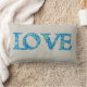 A fun lumbar pillow with the word LOVE in letters filled with a pretty blue and green floral pattern on a hessian-colored (burlap) background.