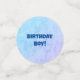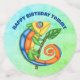 This table confetti for a child's birthday celebration has a fun festive lizard with big eyes holding a green leaf on a stick. He is done in bright colours of orange, yellow, blue and green on various backgrounds of blues and grees. Customise your text with the templates.