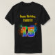 This fun, vibrant shirt design features a colourful bursting celebratory fireworks inspired pattern, along with the number "15" featuring a multicolored rainbow like spectrum or gradient pattern. It also features a personalized name and event message, such as a "Happy Birthday" birthday greeting. A shirt like this might be worn by the guests at a birthday party being held to celebrate somebody’s fifteenth birthday. [~Z0000332]