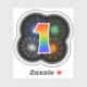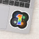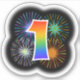 This fun, exciting sticker design features a colourful pattern inspired by bursting celebratory fireworks, along with the number "1" having a multicolored rainbow inspired spectrum or gradient pattern. A fun sticker like this might be used when celebrating somebody’s first birthday, or perhaps a couple’s first wedding anniversary, or some other 1st event. [~Z0000362]