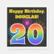 This fun, vibrant paper napkin design features a colourful pattern inspired by celebratory fireworks, along with the number "20" featuring a multicolored rainbow like gradient pattern, on a black coloured background. It also features a personalized name and event message. Paper napkins like this might be used at a birthday party being held to celebrate somebody’s twentieth birthday. [~Z0000326]