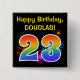 This fun, vibrant button design features a colourful pattern inspired by bursting celebratory fireworks, along with the number "23" having a multicolored rainbow like spectrum or gradient pattern. It also features a customizable name and event message, such as a "Happy Birthday" birthday greeting. A button like this might be worn by the guests at a birthday party being held to celebrate somebody’s twenty third birthday. [~Z0000334]