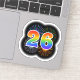 This fun, vibrant sticker design features a colourful bursting celebratory fireworks inspired pattern, along with the number "26" having a multicolored rainbow like spectrum or gradient pattern. A sticker like this might be used when celebrating somebody’s twenty sixth birthday, or perhaps a couple’s twenty sixth wedding anniversary, or some other 26th event. [~Z0000362]