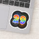 This fun, exciting sticker design features a colourful bursting celebratory fireworks inspired pattern, along with the number "29" featuring a multicolored rainbow like spectrum or gradient pattern. A fun sticker like this might perhaps be used when celebrating somebody’s twenty ninth birthday, or perhaps a couple’s twenty ninth wedding anniversary, or some other 29th event. [~Z0000362]
