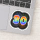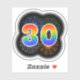 This fun, vibrant sticker design features a colourful pattern inspired by bursting celebratory fireworks, along with the number "30" featuring a multicolored rainbow like spectrum or gradient pattern. A sticker like this might be used when celebrating somebody’s thirtieth birthday, or perhaps a couple’s thirtieth wedding anniversary, or some other 30th event. [~Z0000362]
