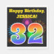 This fun, vibrant paper napkin design features a colourful celebratory fireworks inspired pattern, along with the number "32" having a multicolored rainbow inspired gradient pattern, on a black coloured background. It also features a custom name and event message. Paper napkins like this might be used at a party being held to celebrate somebody’s thirty second birthday. [~Z0000326]