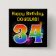 This fun, vibrant button design features a colourful pattern inspired by bursting celebratory fireworks, along with the number "34" featuring a multicolored rainbow like spectrum or gradient pattern. It also features a custom name and event message, such as a "Happy Birthday" birthday greeting. A button like this might be worn by the attendees at a birthday party being held to celebrate somebody’s thirty fourth birthday. [~Z0000334]