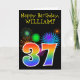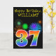 The front of this fun, vibrant birthday greeting card design features a colourful celebratory fireworks inspired pattern, along with the number "37" having a multicolored rainbow inspired gradient pattern, on a black coloured background. The front also features a birthday greeting message, including a personalized recipient name. The inside features a customizable birthday greeting message, or could perhaps be cleared and left blank if a message is to be written by hand instead. A customizable birthday card like this might be a fun way to acknowledge somebody’s thirty seventh birthday. [~Z0000330]