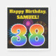 This fun, vibrant paper napkin design features a colorful celebratory fireworks inspired pattern, along with the number "38" having a multicolored rainbow inspired gradient pattern, on a black colored background. It also features a custom name and event message. Paper napkins like this could perhaps be used at a party being held to celebrate somebody’s thirty eighth birthday. [~Z0000326]