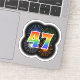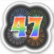 This fun, vibrant sticker design features a colourful pattern inspired by bursting celebratory fireworks, along with the number "47" featuring a multicolored rainbow like spectrum or gradient pattern. A sticker like this might perhaps be used when celebrating somebody’s forty seventh birthday, or perhaps a couple’s forty seventh wedding anniversary, or some other 47th event. [~Z0000362]