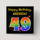 This fun, vibrant button design features a colourful bursting celebratory fireworks inspired pattern, along with the number "49" featuring a multicolored rainbow like spectrum or gradient pattern. It also features a customizable name and event message, such as a "Happy Birthday" birthday greeting. A button like this might be worn by the attendees at a birthday party being held in celebration of somebody’s forty ninth birthday. [~Z0000334]