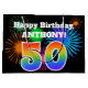 This fun, vibrant gift bag design features a colourful pattern inspired by celebratory fireworks, along with the number "50" featuring a multicolored rainbow inspired gradient pattern, on a black coloured background. It also features a customizable name and event message, such as a birthday greeting. A colourful gift bag like this might be used when wrapping a gift or present that is being given in celebration of somebody’s fiftieth birthday. [~Z0000328]