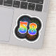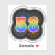This fun, exciting sticker design features a colourful bursting celebratory fireworks inspired pattern, along with the number "58" featuring a multicolored rainbow like spectrum or gradient pattern. A fun sticker like this might perhaps be used when celebrating somebody’s fifty eighth birthday, or perhaps a couple’s fifty eighth wedding anniversary, or some other 58th event. [~Z0000362]
