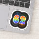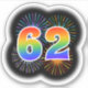This fun, exciting sticker design features a colourful pattern inspired by bursting celebratory fireworks, along with the number "62" featuring a multicolored rainbow inspired spectrum or gradient pattern. A fun sticker like this might be used when celebrating somebody’s sixty second birthday, or perhaps a couple’s sixty second wedding anniversary, or some other 62nd event. [~Z0000362]