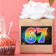 This fun, vibrant sticker design features a colourful pattern inspired by celebratory fireworks, along with the number "67" featuring a multicolored rainbow like gradient pattern, on a black coloured background. Stickers like this could perhaps be given as a small gift while celebrating somebody’s sixty seventh birthday, or perhaps for a couple’s sixty seventh wedding anniversary, or some other 67th event. [~Z0000324]