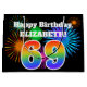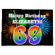 This fun, vibrant gift bag design features a colourful celebratory fireworks inspired pattern, along with the number "69" featuring a multicolored rainbow like gradient pattern, on a black coloured background. It also features a personalized name and event message, such as a birthday greeting. A colourful gift bag like this might be used when wrapping a gift or present that is being given in celebration of somebody’s sixty ninth birthday. [~Z0000328]