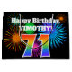 This fun, vibrant gift bag design features a colourful pattern inspired by celebratory fireworks, along with the number "71" having a multicolored rainbow inspired gradient pattern, on a black coloured background. It also features a personalized name and event message, such as a birthday greeting. A gift bag like this might be used to wrap a present or gift being given in celebration of somebody’s seventy first birthday. [~Z0000328]