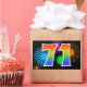 This fun, vibrant sticker design features a colourful pattern inspired by celebratory fireworks, along with the number "71" featuring a multicolored rainbow inspired gradient pattern, on a black coloured background. Stickers like this might be given as a small gift while celebrating somebody’s seventy first birthday, or perhaps for a couple’s seventy first wedding anniversary, or some other 71st event. [~Z0000324]