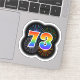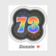 This fun, vibrant sticker design features a colourful pattern inspired by bursting celebratory fireworks, along with the number "73" featuring a multicolored rainbow inspired spectrum or gradient pattern. An exciting sticker like this might be used when celebrating somebody’s seventy third birthday, or perhaps a couple’s seventy third wedding anniversary, or some other 73rd event. [~Z0000362]