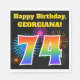 This fun, vibrant paper napkin design features a colourful pattern inspired by celebratory fireworks, along with the number "74" having a multicolored rainbow inspired gradient pattern, on a black coloured background. It also features a customizable name and event message. Paper napkins like this could perhaps be used at a birthday party being held to celebrate somebody’s seventy fourth birthday. [~Z0000326]