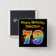 This fun, vibrant button design features a colourful bursting celebratory fireworks inspired pattern, along with the number "79" having a multicolored rainbow like spectrum or gradient pattern. It also features a personalized name and event message, such as a "Happy Birthday" birthday greeting. A button like this might be worn by the attendees at a birthday party being held to celebrate somebody’s seventy ninth birthday. [~Z0000334]
