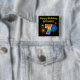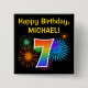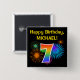 This fun, vibrant button design features a colourful pattern inspired by bursting celebratory fireworks, along with the number "7" having a multicolored rainbow like spectrum or gradient pattern. It also features a custom name and event message, such as a "Happy Birthday" birthday greeting. A button like this might be worn by the attendees at a birthday party being held to celebrate somebody’s seventh birthday. [~Z0000334]