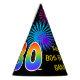 This fun, vibrant birthday party hat design features a colourful bursting celebratory fireworks inspired pattern, along with the number "80" featuring a multicolored rainbow inspired spectrum or gradient pattern. It also features a custom name and event message, such as a "Happy Birthday" birthday greeting. A birthday-themed paper hat like this might be worn by the attendees at a birthday party being held in celebration of somebody’s eightieth birthday. [~Z0000333]