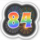 This fun, exciting sticker design features a colourful pattern inspired by bursting celebratory fireworks, along with the number "84" featuring a multicolored rainbow inspired spectrum or gradient pattern. A sticker like this might be used when celebrating somebody’s eighty fourth birthday, or perhaps a couple’s eighty fourth wedding anniversary, or some other 84th event. [~Z0000362]