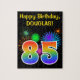 This fun, vibrant puzzle design features a colourful pattern inspired by celebratory fireworks, along with the number "85" featuring a multicolored rainbow like gradient pattern, on a black coloured background. It also features a personalized name and event message, such as a birthday greeting. A puzzle like this might be a fun way to send a greeting message to celebrate somebody’s eighty fifth birthday. [~Z0000329]