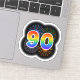 This fun, vibrant sticker design features a colourful pattern inspired by bursting celebratory fireworks, along with the number "90" featuring a multicolored rainbow like spectrum or gradient pattern. A fun sticker like this might perhaps be used when celebrating somebody’s ninetieth birthday, or perhaps a couple’s ninetieth wedding anniversary, or some other 90th event. [~Z0000362]