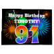 This fun, vibrant gift bag design features a colourful celebratory fireworks inspired pattern, along with the number "91" featuring a multicolored rainbow like gradient pattern, on a black coloured background. It also features a custom name and event message, such as a birthday greeting. A gift bag like this might be used to wrap a present or gift being given in celebration of somebody’s ninety first birthday. [~Z0000328]
