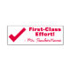 This positive rubber stamp design features the praise message "First-Class Effort!" and a customized educator's name. It also features a decorative checkmark icon. It could be used by a school teacher, educator, instructor, or tutor when grading student work, to acknowledge that a student has done an exceptional job.