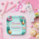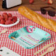 These plates capture the essence of a tropical paradise with their bright pink flamingos standing amid a sea of turquoise hues. The design is complemented by golden pineapples and pink blossoms, creating a festive atmosphere for any poolside feast.
