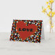My original artwork featuring a graphic art asymmetrical red heart with text spelling LOVE in the centre with gold shadowing. The heart is placed on a retro style floral pattern in red, yellow and black tones for the background. The inside states "You are my love forever! Happy Valentine’s Day! ". This card is a nice way to express your love for someone!