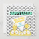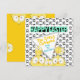 With five cartoon, crazy eyed chickens, on a black and white chicken foot print background in front and another five crazy chickens peeking-in, on a yellow background on the back, this one is just so much fun!